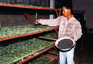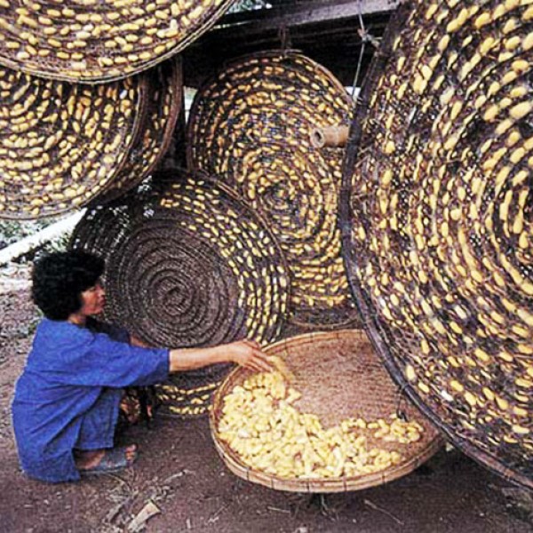 หมู่บ้านปลูกหม่อนเลี้ยงไหมบ้านหลุ่งประดู่สามัคคี ชาวบ้านที่นี่มีการรวมกลุ่มทอผ้าใช้ชื่อว่า “กลุ่มไหมไทยหลุ่งประดู่”ผลิตภัณฑ์ทอเป็นผ้าคลุมไหล่ ผ้าลายมัดหมี่ ผ้าลายสก๊อต ผ้าหางกระรอก การทอผ้าของกลุ่มมีการแบ่งงานกันทำตามความถนัด บางคนมัดหมี่ บางคนทอ ใครไม่มีกี่ทอผ้าที่บ้าน ที่นี่จะให้ยืมไปใช้ หรือจะมาทอที่นี่ก็ได้ การปลูกหม่อนเลี้ยงไหม ปัจจุบันเหลือไม่กี่ราย เมื่อก่อนมีเยอะ ขึ้นกับราคารังไหมด้วย ถ้าราคาดีคนจะหันมาปลูกหม่อนเลี้ยงไหมกัน แต่มีช่วงหนึ่งที่ราคาไหมตกต่ำมาก สาเหตุมาจากมีการลักลอบนำเข้าไหมราคาถูกมาจากประเทศจีน ช่วงเวลานี้การทำนา ทำไร่อ้อย ไร่มันสำปะหลัง ปลูกยูคาลิปตัส ถือว่าได้ราคาดี คนทอผ้าส่วนใหญ่อายุ 40-50 ปี ผ้าไหมที่เป็นเอกลักษณ์ของที่นี่คือ ผ้าหางกระรอก ถ้าเป็นหางกระรอกธรรมดาแต่ที่นี่มีการประยุกต์ลาย เป็นเกลียวถี่เกลียวห่างเกลียวกลาง การกลับมาใช้สีธรรมชาติย้อมทำมาได้สัก 6-7 ปีแล้ว แต่จะมีพวกมัดหมี่ที่ยังใช้สีเคมี ซึ่งก็ขึ้นอยู่กับลูกค้าด้วยว่าต้องการสีแบบไหน หลังการย้อมสีผ้าไหม ที่นี่จะต้มใบยูคาลิปตัสใส่ไปด้วย ช่วยทำให้สีย้อมไม่ออก ผ้าไม่ตกสี การรวมกลุ่มทอผ้าไหม ได้รับการสนับสนุนเป็นอย่างดีจากหลายหน่วยงาน เนื่องจากเส้นไหมโรงงานมีราคาแพง ทางกลุ่มมีต้นทุนน้อย หน่วยงานต่าง ๆ จึงให้งบประมาณในการซื้อวัตถุดิบและให้เป็นเบี้ยเลี้ยง การของบประมาณจะสลับเวียนไปในแต่ละปีแต่ละหน่วยงาน ได้แก่ บ้านนารีสวัสดิ์ นิคมสร้างตนเอง อำเภอพิมาย องค์การบริหารส่วนตำบลหลุ่งประดู่ โดยรายได้ของกลุ่มจะหักไว้ 30 เปอร์เซ็นต์ เก็บไว้ใช้ในการบริหารจัดการ จากการได้รับการพัฒนาผลิตภัณฑ์ ในปี พ.ศ. 2553 อำเภอห้วยแถลงพิจารณาคัดเลือกกลุ่มไหมไทยหลุ่งประดู่เข้าอบรมตามโครงการ KBO การอบรมโดยใช้งบประมาณจากกรมการพัฒนาชุมชนอบรมระดับจังหวัด มีการส่งเข้าประกวด แล้วได้รับรางวัลที่1 ของจังหวัด ทำให้ผ้าไหมหางกระรอกลายไตรลักษณ์เป็นลายเอกลักษณ์ประจำจังหวัดนครราชสีมา โดยมีนางชูศรี คะเรียงรัมย์ นางประดิษฐ์ ทองปอ เป็นผู้ถ่ายทอดองค์ความรู้ มีการสร้างเครือข่ายองค์ความรู้แก่สมาชิกเครือข่ายในจังหวัดนครราชสีมา ด้านการอบรมมีมหาลัยราชภัฎนครราชสีมาให้การสนับสนุนงบประมาณ เทคนิคและขั้นตอนการทอผ้าไหมหางกระรอกลายไตรลักษณ์มีดังนี้ เริ่มด้วยการเรียงเส้นยืนด้วยเส้นไหมย้อมสีธรรมชาติ มีสีส้ม สีเหลือง สีขาว สีชมพู สีเทา ในลักษณะการทอผ้าเกล็ดเต่า เส้นพุ่งที่นำมาทอผ้ามี 2 ประเภท คือ เส้นพุ่งที่ใช้เส้นไ
